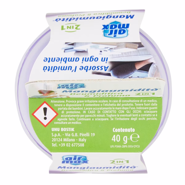 Deumidifica e profuma i piccoli ambienti e spazi con scarsa ventilazione come cassetti, scarpiere, armadi, ripostigli. Kit 40gr usa e getta, non ricaricabile. Efficace fino a 6 settimane. Le perdite accidentali di fluido possono causare macchie superficiali.
