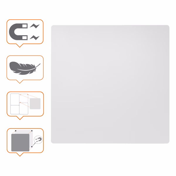 Questa elegante lavagna magnetica senza cornice è lo strumento di collaborazione ideale per qualsiasi ambiente d’ufficio. Il suo design modulare consente di creare e ampliare lo spazio di scrittura in base alle proprie esigenze, senza alcun limite. Grazie all’innovativo sistema di montaggio magnetico, le lavagne leggere possono essere facilmente rimosse per essere utilizzate su una superficie piana e reinserite a parete in qualsiasi momento, offrendo la massima flessibilità. Lavagna magnetica in acciaio Dimensioni 45x45cm.
