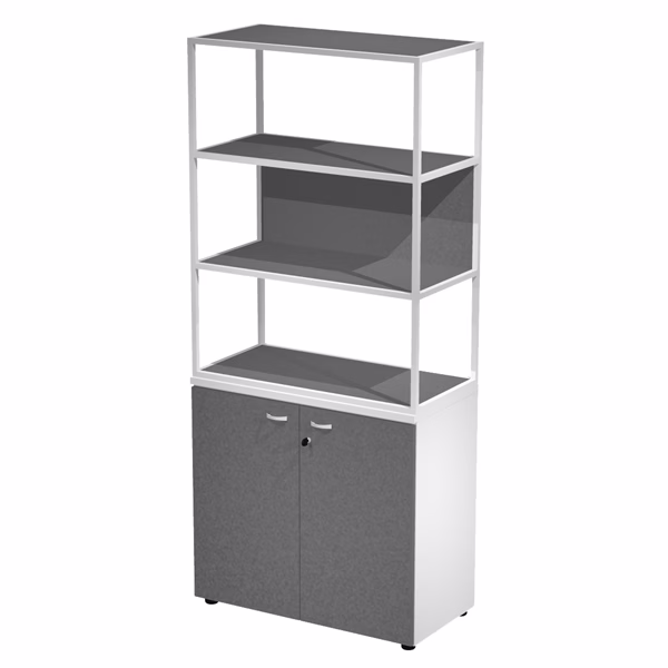 Libreria in metallo a 3 vani con struttura 20×20 mm a giorno con ripiani, base, cappello e un dietro in melaminico , sovrapposta ad un armadio basso, completo di ante battenti con serratura. Libreria metal completa di 1 dietro in melaminico posizionabile a scelta in fase di montaggio. Dimensioni: 90x46xH204cm