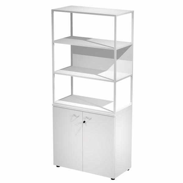 Libreria in metallo a 3 vani con struttura 20×20 mm a giorno con ripiani, base, cappello e un dietro in melaminico , sovrapposta ad un armadio basso, completo di ante battenti con serratura. Libreria metal completa di 1 dietro in melaminico posizionabile a scelta in fase di montaggio. Dimensioni: 90x46xH204cm