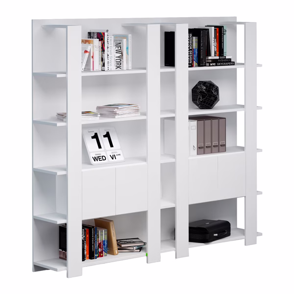 Libreria Concept alta a giorno a 5 ripiani fissi. Struttura in truciolare nobilitato melaminico. Ripiani fissi sempre bianchi sp.22 mm. Solido retro spessore 18mm in finitura della libreria. Larghezza interna tra le fasce 60cm. Spazio tra i ripiani in altezza 35cm. Antine in finitura disponibili a parte. Dimensioni: L100 x P38,6 x H198cm.