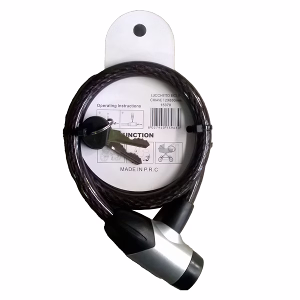 Lucchetto a spirale a due chiavi. Dimensioni ?12x650mm. Consigliato per biciclette e moto.
