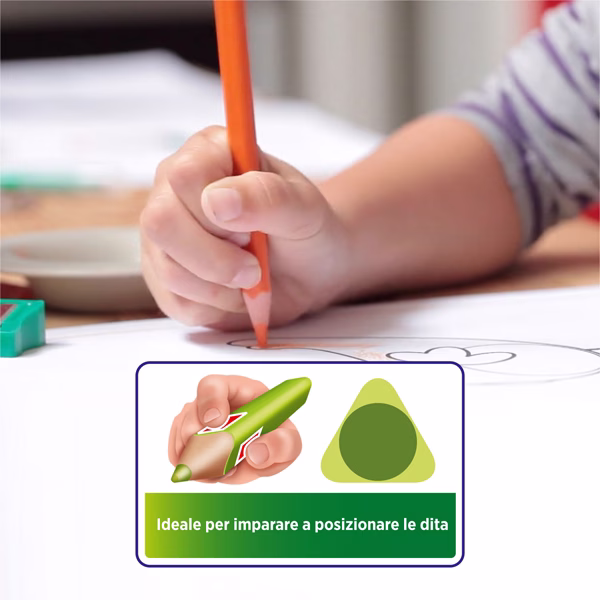 Matite in resina senza legno. Facili da temperare. Non fanno schegge se spezzate. Mina ultraresistente. Difficili da rosicchiare. Colori brillanti. Fornite in astuccio in cartone appendibile. Fusto triangolare ampio per la primissima infanzia (con 55% di materiale riciclato e certificazione ecologica NF Environmenti).