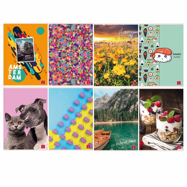 Maxiquaderno rilegato con punto metallico. Copertina in cartoncino da 205gr verniciatura UV. Risguardo personalizzabile stampato fronte e retro. Fantasie assortite 2024.