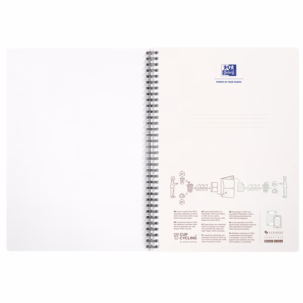 Maxiquaderni spiralati con copertina in colori naturali realizzata con carta riciclata al 100% contenente fibre riciclate da bicchieri di carta usati. 180 pagine di carta da 90g bianca 100% riciclata e liscia per una esperienza di scrittura confortevole senza che l’inchiostro attraversi la pagina. Spirale doppia di colore grigio. Rigature funzionali con margine e intestazione per prendere appunti in modo organizzato. Speciali marcatori agli angoli delle pagine da utilizzare con l’App SCRIBZEE®. La gamma My Rec’up ha ricevuto la certificazione PEFC Recycled Ecolabel.