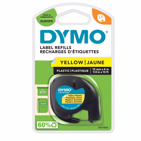 Nastro Letratag 912020 – in plastica – 12 mm x 4mt – giallo – Dymo