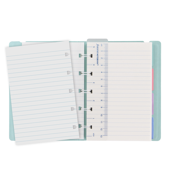 Notebook dotato di copertina in similpelle goffrata e chiusura con elastico. Fornito con 56 pagine a righe e ulteriori 8 pagine omaggio (4 a quadretti, 4 bianche); inclusi un righello in plastica e 4 divisori colorati di cui uno con tasca. Fogli, righello e divisori possono essere facilmente rimossi e riposizionati a piacimento.