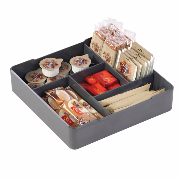 ORGANIZER da TAVOLO COFFEE POINT dotato di 5 scomparti per ospitare il necessario per servire il caffè. Il comparto centrale può contenere il mini cestino. A fine utilizzo l’organizer può essere riposto nel COFFE POINT BOX. Dimensione: H4,8 x L21 x P21cm. Materiali di ottima qualità lavabili in lavastoviglie e adatti all’uso alimentare.