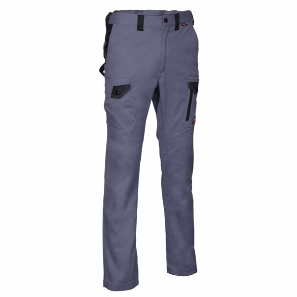 2 ampie tasche anteriori, doppia tasca posteriore con pattina chiusa con snap, passante portamartello, taglio ergonomico di gambe e ginocchia, tasca laterale destra chiusa con snap, tasca laterale sinistra con doppia apertura (chiusa con snap e con zip), tessuto ad elevata percezione elastica