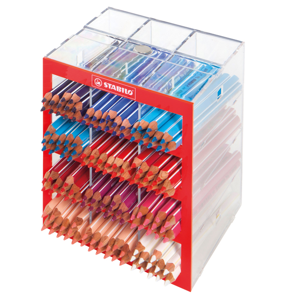 Espositore da banco con 144 pastelli colorati Trio Thick in 12 colori assortiti: bianco, arancione, rosso ciliegia, rosa, albicocca, blu viola, blu oltremare, blu cielo, verde, verde chiaro, marrone chiaro e nero.