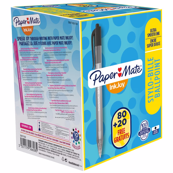 Papermate InkJoy 100, un sistema di inchiostro ULV per una incredibile scorrevolezza di scrittura e asciugatura rapida. I colori sono accesi e intensi, non sbava, richiede una minima pressione della mano e assicura linee precise e nette. Posside un fusto triangolare traslucido del colore dell’ inchiostro.