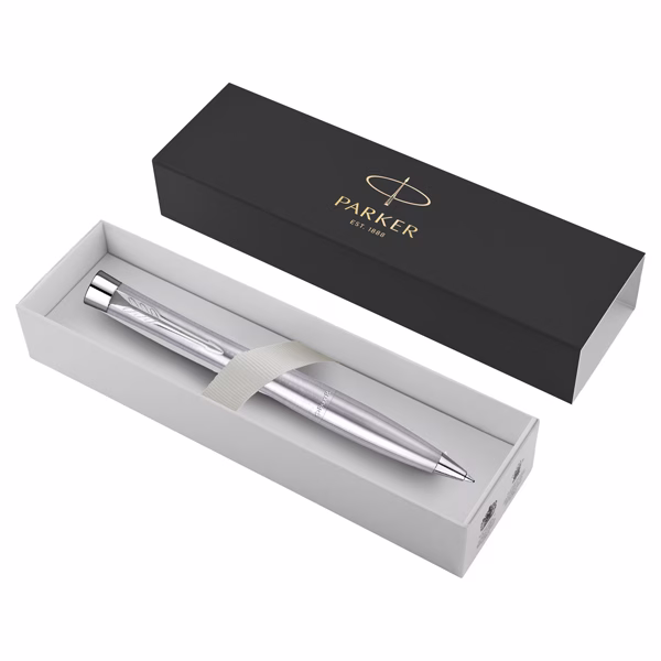 Penna Parker con finitura metallizzata e lucidatura per rinforzare la qualità della lavorazione. Integrato con finiture cromate. Confezionata in elegante astuccio regalo. Fornita con refill colore blu.