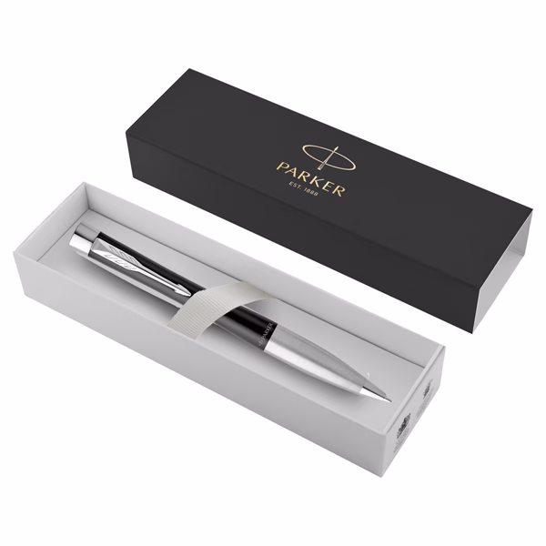 Penna Parker con lacca nera dal tocco mattato per rinforzare l’esclusività della finitura. Integrato con finiture cromate. Confezionata in elegante astuccio regalo. Fornita con refill colore blu.