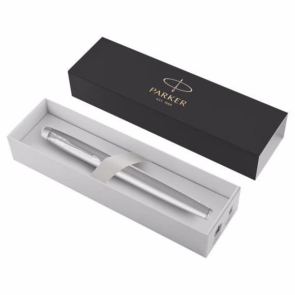 Penna Parker in acciaio inossidabile con finiture smerigliate e completata con finiture cromate. Confezionata in elegante astuccio regalo. Fornita con cartuccia colore blu.