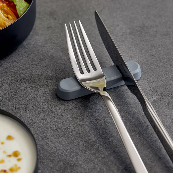 Poggiaposate in melamina grigia. Lavabili in lavastoviglie. Dimensioni: 8x2x1cm.