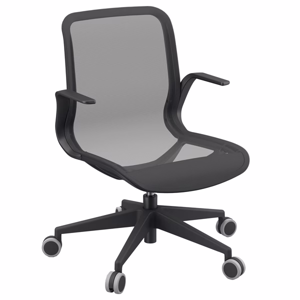 Poltrona direzionale girevole con elevazione a gas – meccanismo oscillante – base nylon. Rivestimento seduta in rete nera. Braccioli inclusi (non rimovibili). Alt.tot.: 88-111cm; Prof.tot.: 66cm; Alt.schienale: 51cm; Larg.schienale: 46cm; Larg.seduta: 49cm; Prof.Sedile: 46cm; Altezza sedile: 44 – 55cm.