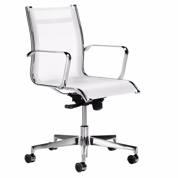 Poltrona direzionale girevole con elevazione a gas – meccanismo oscillante con blocchi. Rivestimento seduta in rete di colore bianco. Braccioli inclusi (non rimovibili). Alt.tot.: 79-90cm; Prof.tot.: 68cm; Alt.schienale: 41cm; Larg.schienale: 48cm; Larg.seduta: 50cm; Prof.Sedile: 50cm.
