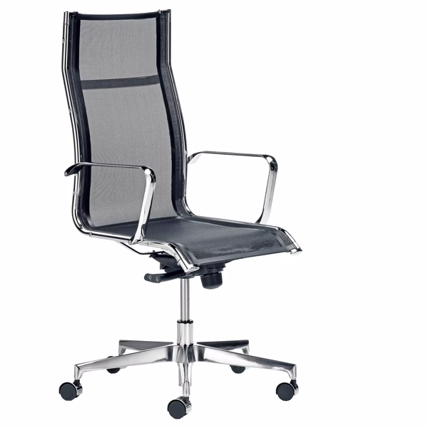 Poltrona direzionale girevole con elevazione a gas – con 4 blocchi anti shock – meccanismo oscillante con fulcro avanzato. Rivestimento seduta in rete di colore nero. Braccioli inclusi (non rimovibili). Alt.tot.: 105-116cm; Prof.tot.: 68cm; Alt.schienale: 60cm; Larg.schienale: 48cm; Larg.seduta: 50cm; Prof.Sedile: 50cm.