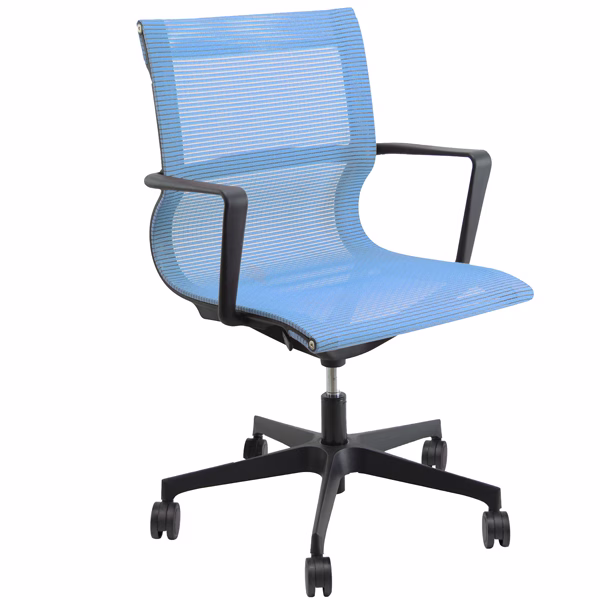 Poltrona direzionale girevole con elevazione a gas – meccanismo oscillante libero – schienale fisso in rete. Braccioli inclusi (non rimovibili). Alt.tot.: 91-99cm; Prof.tot.: 68cm; Alt.schienale: 52cm; Larg.schienale: 50cm; Larg.seduta: 50cm; Prof.Sedile: 49cm; Altezza sedile: 44-52cm.
