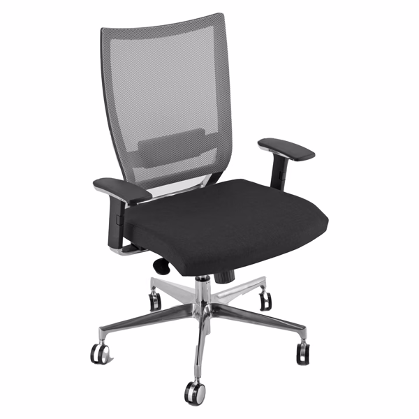 Poltrona indicata per utilizzo intenso (H24) e per pesi fino a 150kg. Schienale alto in rete grigia con supporto lombare regolabile. Rivestimento seduta in acrilico ignifugo. Braccioli in pressofusione, base e struttura in alluminio/acciaio; ruote in acciaio gommate. Meccanismo syncro. Meccanismo anti shock, meccanismo a contatto permanente. Elevazione a gas. Indicata per utilizzo intenso e per pesi fino a 150 kg