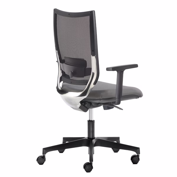 Seduta semidirezionale ergonomica girevole – elevazione a gas – meccanismo synchro – meccanismo anti shock – meccanismo a contatto permanente dotata di supporto lombare regolabile – struttura in alluminio pressofuso; Rivestimento seduta in tessuto “FASHION – Salò” 100% poliestere e certificazione di infiammabilità 1IM UNI 9175 EN 1021. Completa di braccioli regolabili. Alt.tot.: 98-108cm; Prof.tot.: 68cm; Alt.schienale: 52cm; Larg.schienale: 45cm; Larg.seduta: 49cm; Prof.Sedile: 48cm; Altezza sedile: 42-53cm .