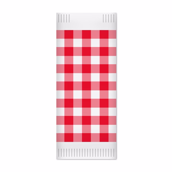 Confezione da 1000 porta posate di carta. Gamma informale in cellulosa decorata per tutti i giorni. Linea Snack Colore: quadretti rossi e bianchi