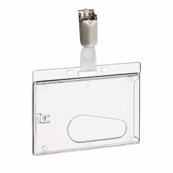 Portabadge in rigido polistirene crystal clear di alta qualità, dotato di asola sulla parte frontale per facilitare la rimozione del badge e di un fermo interno per mantenere in posizione il badge inserito. Fornito di clip in metallo orientabile con protezione interna in plastica salva tessuto.