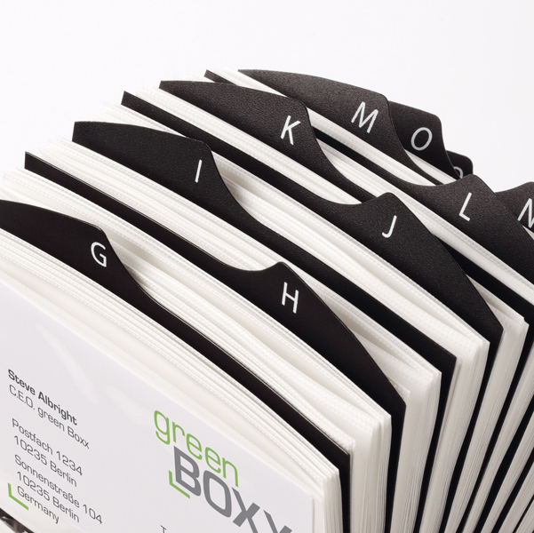 Schedario rotativo dal design moderno e dalla robusta struttura in metallo nero. Fornito con 200 buste trasparenti doppio lato per 400 biglietti da visita. Dotato di divisore alfabetico a 25 tasti. Dimensioni: 19,5x12x19cm.