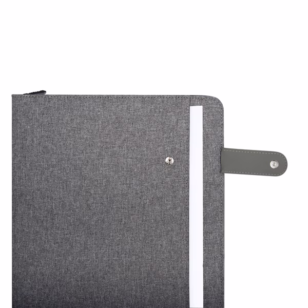 Portablocco in tessuto tecnico e chiusura in ecopelle. Formato A4 chiusura con zip, tasca esterna con chiusura a bottone, scomparti per biglietti, tasca interna portadocumenti, portapenna, completo di blocco.