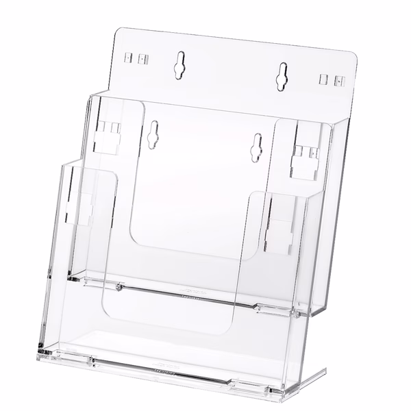 Portadepliant in Polistirene trasparente componibili, da banco e da parete. Formato: 23x27cm. ProfonditÓ 7cm. A 2 tasche