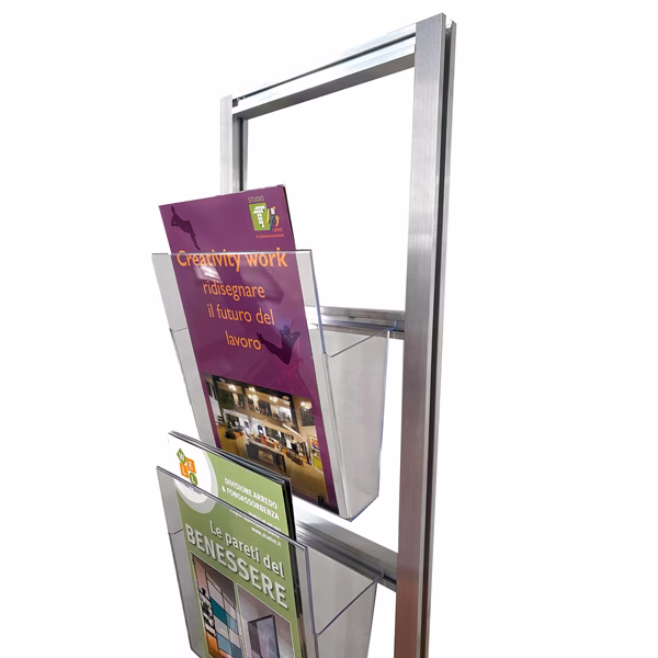 Espositore porta depliant. Montanti in alluminio e tasca Vision molto contenitiva formato A4 comodo.