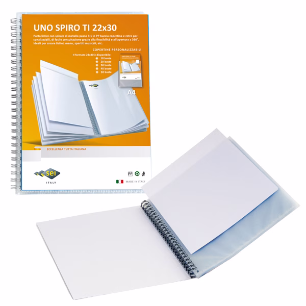 Porta listini con spirale di metallo passo 3:1 in PP buccia con copertina e retro personalizzabili, di facile consultazione grazie alla flessibilità e all’apertura a 360°. Ideali per listini, cantici, messali. Formato contenuto: 220x300mm(A4). Contiene 30 buste.