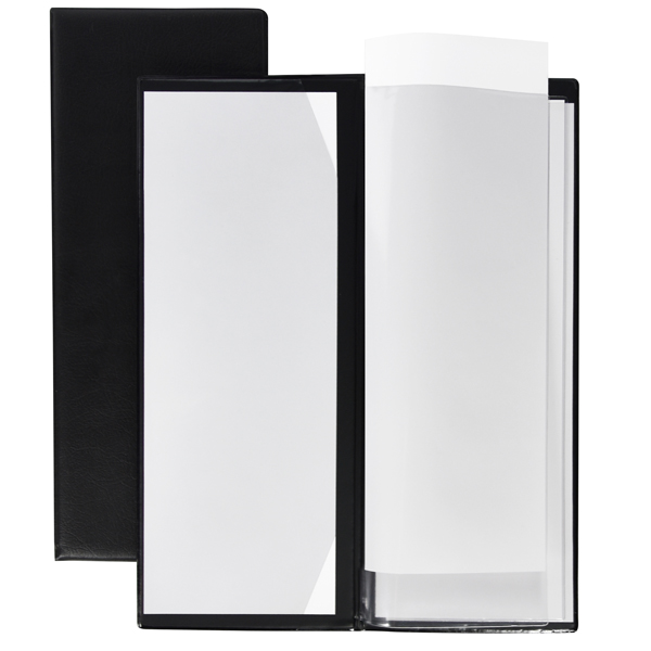 Porta menu in PVC con elegante copertina in plastica espansa. Due tasche interne + 2 buste. Contiene fino a 6 fogli. Ideali per ristoranti, pizzerie, pubs, hotels. Adatti ad essere personalizzati. Formato contenuto: 110x310mm.