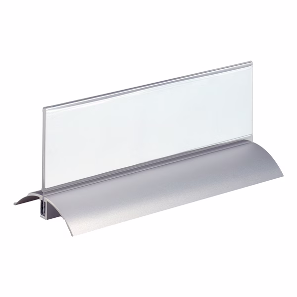 In acrilico trasparente e base in alluminio. Questi portanome da tavolo si adattano a qualunque ambiente grazie alla loro eleganza e design. Dotati di cartoncino inserto bianco stampabile con software duraprint.
