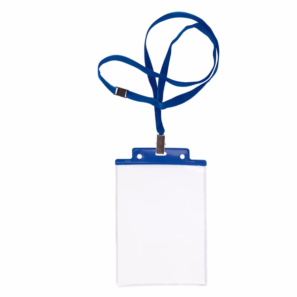Porta nomi in PVC trasparente pesante con cordoncino blu con dettagli blu. Pinzetta e chiusura antisoffocamento. Formato contenuto 10×15 cm. Apertura lato corto (alto)