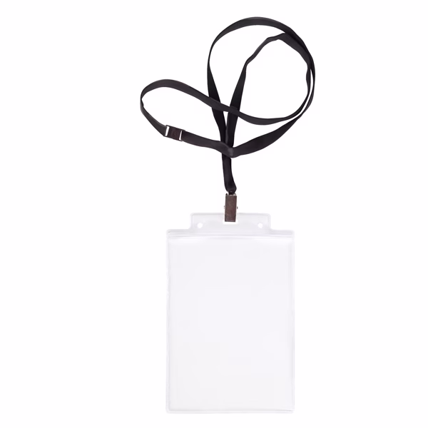 Porta nomi in PVC trasparente pesante con cordoncino nero con dettagli neutri. Pinzetta e chiusura antisoffocamento. Formato contenuto 10×15 cm. Apertura lato corto (alto)