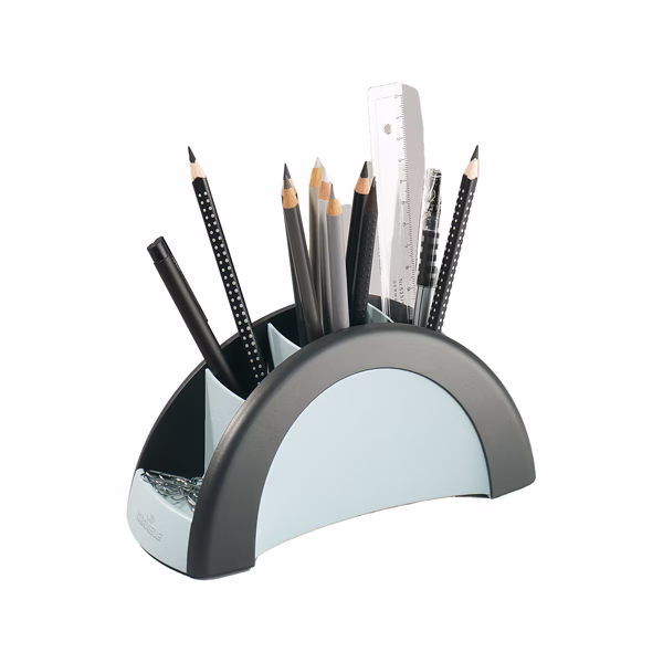 Portapenne a 5 comparti per matite, penne, fermagli, forbici, gomma etc. Dotato di gommini antiscivolo che lo rendono estremamente stabile.