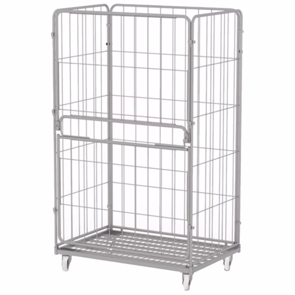 Carrello Roll Container con 4 sponde laterali, di cui una con ribalta, in filo zincato, 4 ruote nylon 10cm, 2 fisse e 2 girevoli. Portata 500kg. Dimensioni:120Lx80Px198Hcm. Fornito smontato.