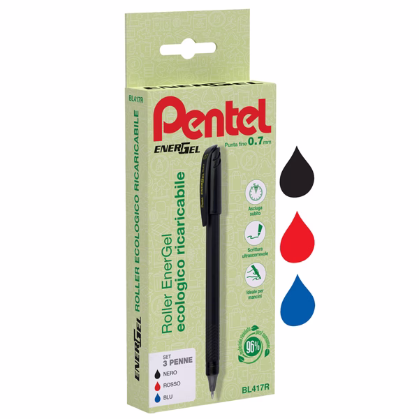 Roller a cappuccio con inchiostro Energel ultrascorrevole ad asciugatura istantanea. Realizzato con il 96% di materiale riciclato post-consumer. Punta 0,7 mm. Ricaricabile con refill LR7. Astuccio 3 colori (nero/rosso/blu).