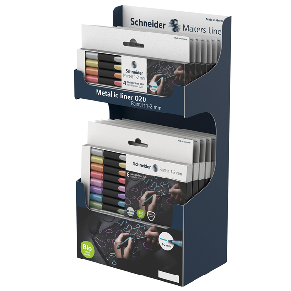 Espositore da banco con pennarelli metalizzate con punta 1-2mm. Ideale per carta patinata come biglietti d’auguri. L’espositore contiene 8 astucci da 4 colori e 6 astucci da 8 colori.