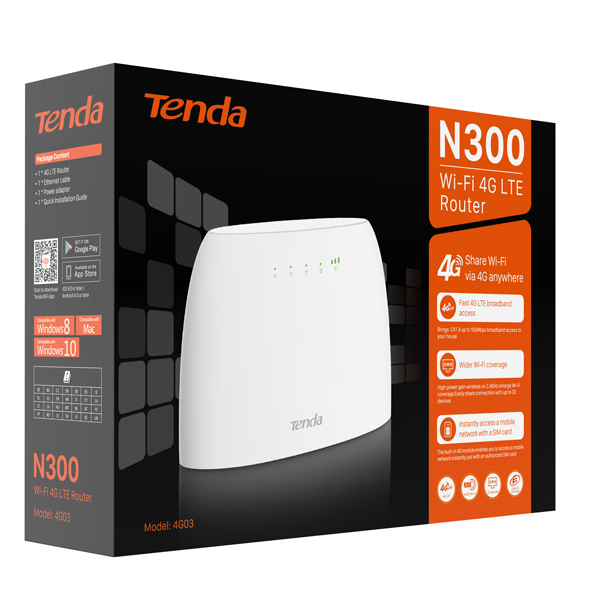 Il 4G03 è il router N300 Wi-Fi 4G di casa Tenda che permette di utilizzare la connessione Internet 4G LTE Cat4 fino a 150 Mbps semplicemente inserendo una scheda SIM. Il router è dotato di una potente CPU funzionante a 880 MHz prodotta con processo a 28nm e grazie alle sue caratteristiche, riesce a soddisfare le esigenze di tutti. Inoltre, il suo design unico ed elegante lo rende un oggetto da arredamento per la tua casa o ufficio