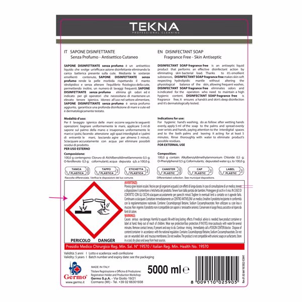 Sapone disinfettante, antisettico liquido cutaneo dermatologicamente testato, non profumato. Certificato Presidio medico Chirurgico e Haccp. Indicato anche per lavaggi frequenti. Svolge un’efficace azione disinfettante ed elimina la carica batterica presente sulla cute senza alterarne l’equilibrio fisiologico. Idoneo per il settore alimentare.
