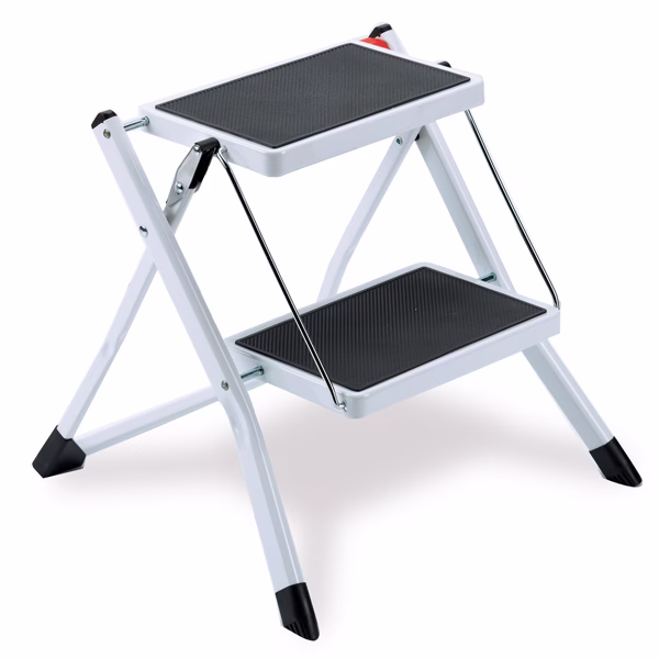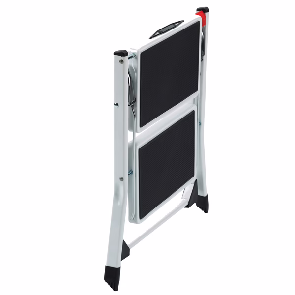 Sgabello pieghevole in acciaio per uso domestico e bricolage. Prodotto certificato secondo la normativa europea EN14183. Portata garantita 150 kg. Struttura in acciaio, con blocco antichiusura con tasto di sblocco. Comodo manico per il trasporto. Piedini antisdrucciolo. Due ampi gradini con tappetini antiscivolo. Facile da riporre: ingombro chiuso, misura solo 4 cm.