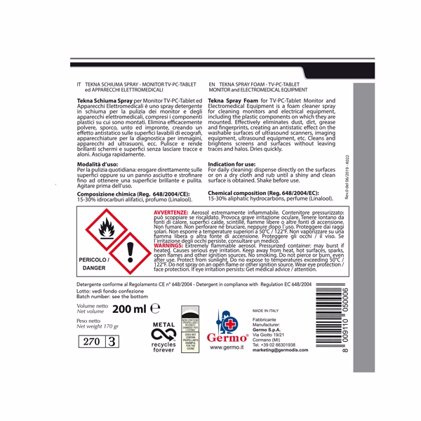 Spray detergente 200ml in schiuma per monitor, tv, pc, tablet e apparecchi elettromedicali ideale per pulire e rendere brillanti schermi e superfici senza lasciare tracce ed aloni. Elimina efficacemente polvere, sporco, unto ed impronte, creando un effetto antistatico sulle superfici lavabili di ecografi, apparecchiature per la diagnostica per immagini, apparecchi ad ultrasuoni, ecc. Asciuga rapidamente.