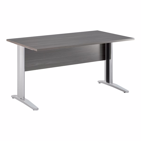 Scrivanie con dimensioni conformi alle normative sulla sicurezza dei posti di lavoro in ufficio. Bordatura dei piani in ABS 2mm antishock ed assenza di spigoli vivi. Le scrivanie sono disponibili nella versione con fianchi pannello in melaminico (sp. 22 mm) o con fianchi in metallo ad L verniciati effetto cromo completi di piedini regolabili in altezza e canalina passacavi ispezionabile. Dimensioni: L160 x P80 x H72cm