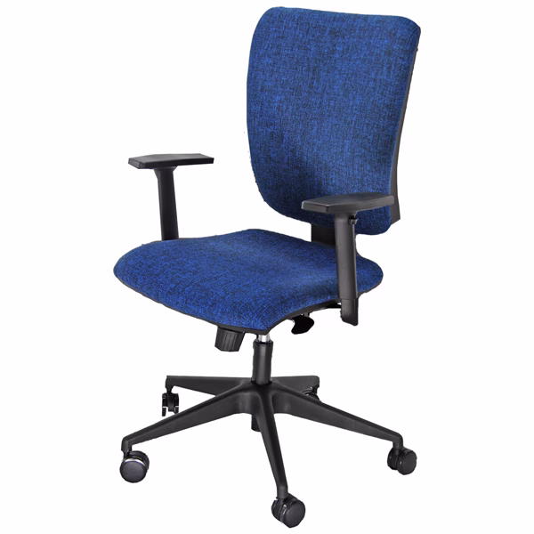 Sedia girevole operativa. Meccanismi: elevazione a gas – schienale regolabile up-down – meccanismo synchro con sedile traslabile – anti shock – meccanismo a contatto permanente. Rivestimento seduta in tessuto “SUPER – Expo” 100% poliestere e reazione al fuoco classe 1. Completa di braccioli regolabili. Alt.tot.: 97-109cm; Prof.tot.: 68cm; Alt.schienale: 46cm; Larg.schienale: 46cm; Larg.seduta: 50cm; Prof.Sedile: 46cm; Alt. sedile: 42-54cm.