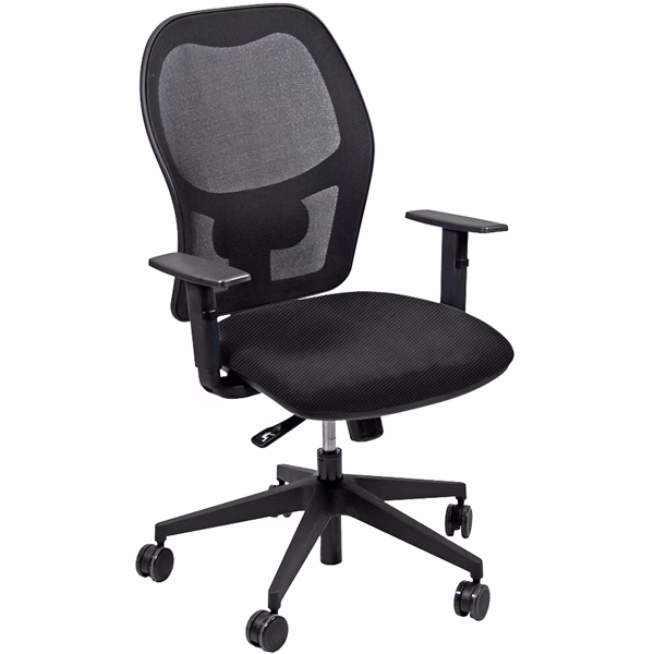 Seduta operativa girevole con elevazione a gas, meccanismo syncro, 4 blocchi anti shock e meccanismo a contatto permanente. Schienale con supporto lombare regolabile. Completa di braccioli regolabili. Rivestimento in tessuto “SUPER – Target” 100% poliestere idrorepellente antimacchia e reazione al fuoco classe 1. Alt.tot: 102-113cm; Prof.tot: 68cm; Alt.schienale: 60cm; Largh.schienale: 48cm; Largh.sedile: 48cm; Prof.sedile: 46cm; Alt.sedile: 42-54cm.
