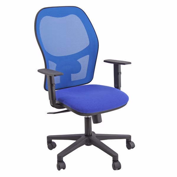 Seduta operativa girevole su ruote con schienale in rete blu- elevazione a gas – supporto lombare regolabile – meccanismo syncro tra sedile e schienale, a contatto permanente – schienale con ritorno controllato 3 blocchi. Rivestimento seduta in tessuto “ECO- Eco” 100% polipropilene. Completa di braccioli regolabili. Alt.tot.: 102-113cm; Prof.tot.: 63cm; Alt.schienale: 60cm; Larg.schienale: 48cm; Larg.seduta: 48cm; Prof.Sedile: 46cm; Alt. sedile: 42-54cm.