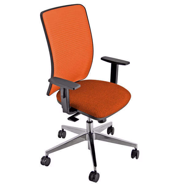 Seduta operativa girevole con elevazione a gas meccanismo synchro con 4 blocchi anti shock meccanismo a contatto permanente – supporto lombare regolabile – base alluminio – rivestimento schienale in tessuto con gel interposto. Rivestimento seduta in tessuto “SUPER – King L” 100% TREVIRA e reazione al fuoco classe 1. Completa di braccioli regolabili. Alt.tot.: 98-109cm; Prof.tot.: 68cm; Alt.schienale: 62cm; Larg.schienale: 45cm; Larg.seduta: 51cm; Prof.Sedile: 46cm; Alt. sedile: 42-54cm.