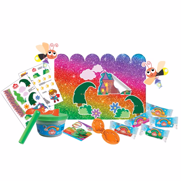 Set composto da 5 salsicciotti da 50g, 1 vasetto da 100g di pasta per giocare Didòglitter, 1 formina nacchera, 1 mattarello, 1 coltellino, 1 foglietto stickers, 1 foglietto fgurine in cartoncino 1 scenario da ritagliare, 1 Didòguida, 1 salvadidò.